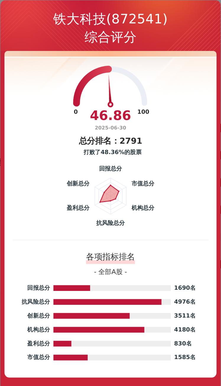 金融界上市公司研究院构建了一套上市公司韧性评价体系,从企业盈利、科技创新、股东回报、经营抗风险、市值表现及机构吸引力六个维度对企业进行量化评分,满分为100分。铁大科技的韧性评价总分为46.86分,在A股5405家可比上市公司中排名第2791位。