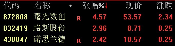 北交所212只个股中,今日有49只个股上涨,136只个股下跌,其中曙光数创(BJ872808,股价53.57元,市值107亿元)、路斯股份(BJ832419,股价8.71元,市值9亿元)涨幅靠前,分别上涨了4.57%、2.96%;下跌方面,华洋赛车(BJ834058,股价16.61元,市值9.3亿元)下跌了9.58%。