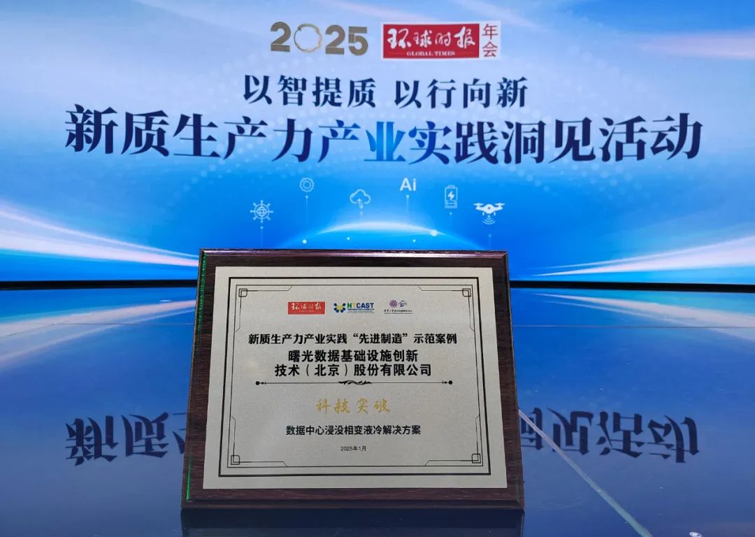 2025年1月8日,由环球时报社携手中国科协新技术开发中心、清华大学技术创新研究中心等权威机构联合发起的“2025环球时报年会——新质生产力产业实践洞见活动”在北京人民日报社新媒体大楼盛大启幕。大会同期发布了2024新质生产力产业实践示范案例,曙光数创“数据中心浸没相变液冷解决方案”,成功入选2024新质生产力产业实践“先进制造”示范案例。