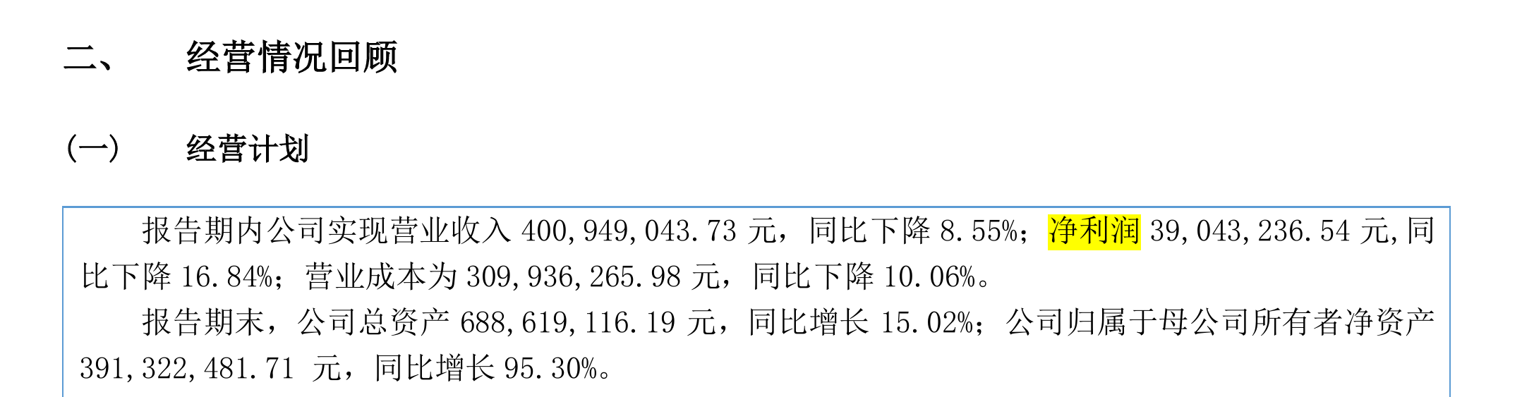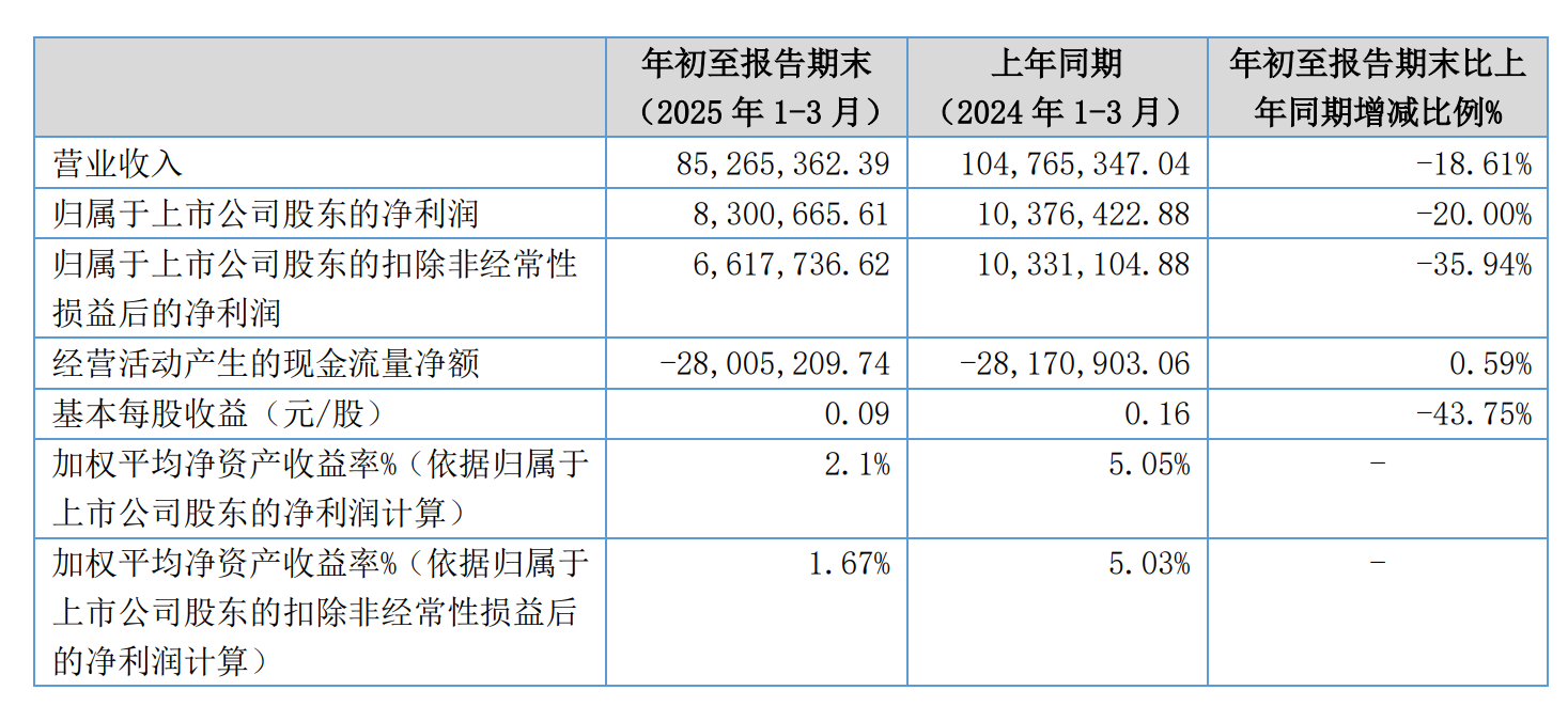 此后公司发布的季报显示,今年第一季度,该公司实现营业收入85,265,362.39元,同比下降18.61%;归属于上市公司股东的净利润8,300,665.61元,同比下降20%。