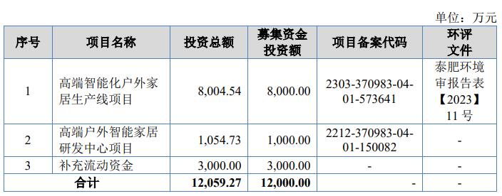 泰鹏智能2023年10月30日发布的向不特定合格投资者公开发行股票并在北京证券交易所上市招股说明书显示,公司拟募集资金12,000.00万元,分别用于高端智能化户外家居生产线项目、高端户外智能家居研发中心项目、补充流动资金。