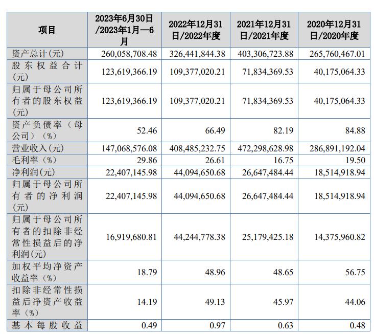 2020年、2021年、2022年、2023年1-6月,泰鹏智能营业收入分别为28,689.12万元、47,229.86万元、40,848.52万元、14,706.86万元;归属于母公司所有者的净利润分别为1,851.49万元、2,664.75万元、4,409.47万元、2,240.71万元;归属于母公司所有者的扣除非经常性损益后的净利润1,437.60万元、2,517.94万元、4,424.48万元、1,691.97万元。