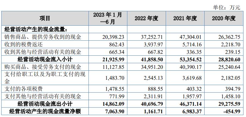上述同期,泰鹏智能销售商品、提供劳务收到的现金分别为26,362.75万元、47,304.01万元、37,252.71万元、20,398.23万元;经营活动产生的现金流量净额分别为-454.99万元、6,983.37万元、1,161.71万元、7,063.90万元。