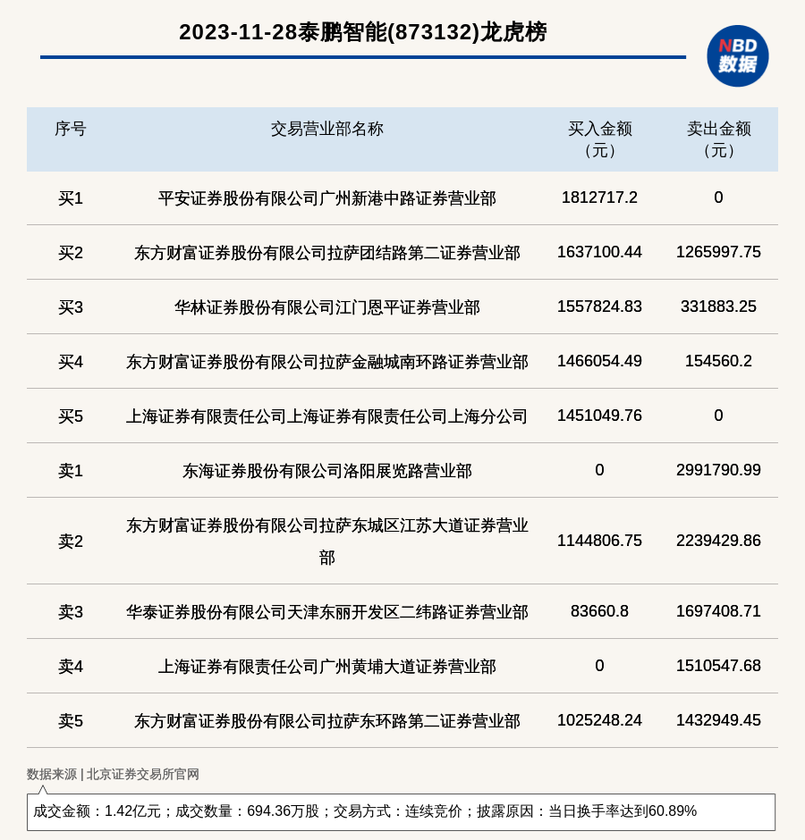 2023年11月28日,北交所上市公司泰鹏智能(873132,收盘价:20.91元)登上龙虎榜,交易方式是连续竞价,披露原因是当日换手率达到60.89%,成交数量694.36万股,成交金额1.42亿元。买一席位为平安证券股份有限公司广州新港中路证券营业部,买入181.27万元;卖一席位为东海证券股份有限公司洛阳展览路营业部,卖出299.18万元。