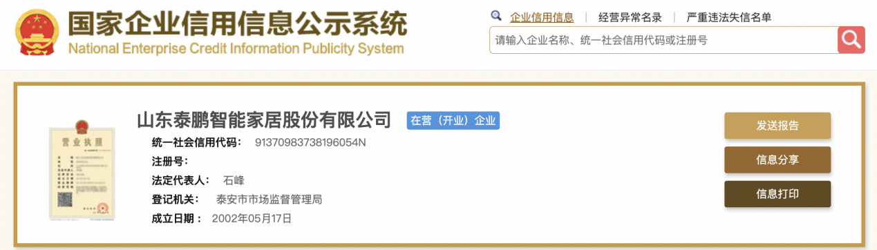 据查,山东泰鹏智能家居股份有限公司成立于2002-05-17,法定代表人为石峰,注册资本为5916万元,经营范围包含:家具制造;家居用品制造;体育用品及器材制造等。该公司大股东为山东泰鹏集团有限公司,持股57.18%。