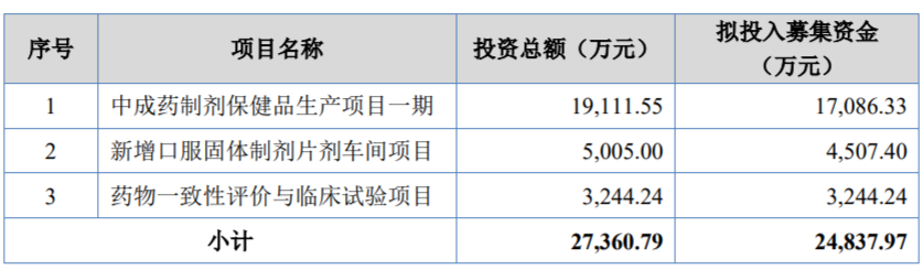 新赣江2023年1月9日披露的招股说明书显示,公司拟募集资金24,837.97万元,用于中成药制剂保健品生产项目一期、新增口服固体制剂片剂车间项目、药物一致性评价与临床试验项目。