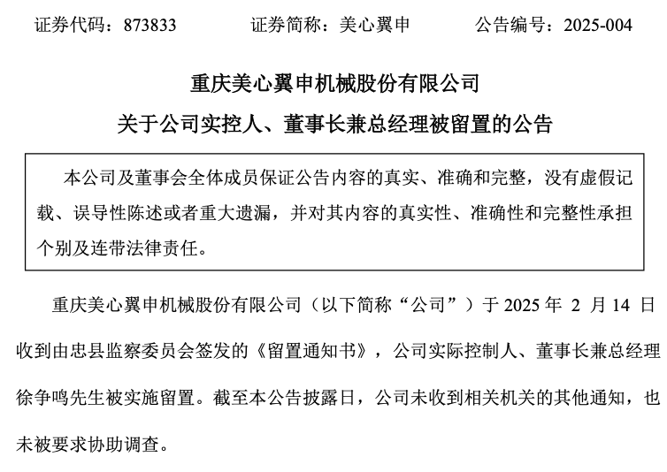 近日,北交所上市企业美心翼申(股票代码:873833)发布了一则重要公告,披露了公司实际控制人、董事长兼总经理徐争鸣被忠县监察委员会实施留置的消息。据悉,这一通知是在2月14日正式签发的。